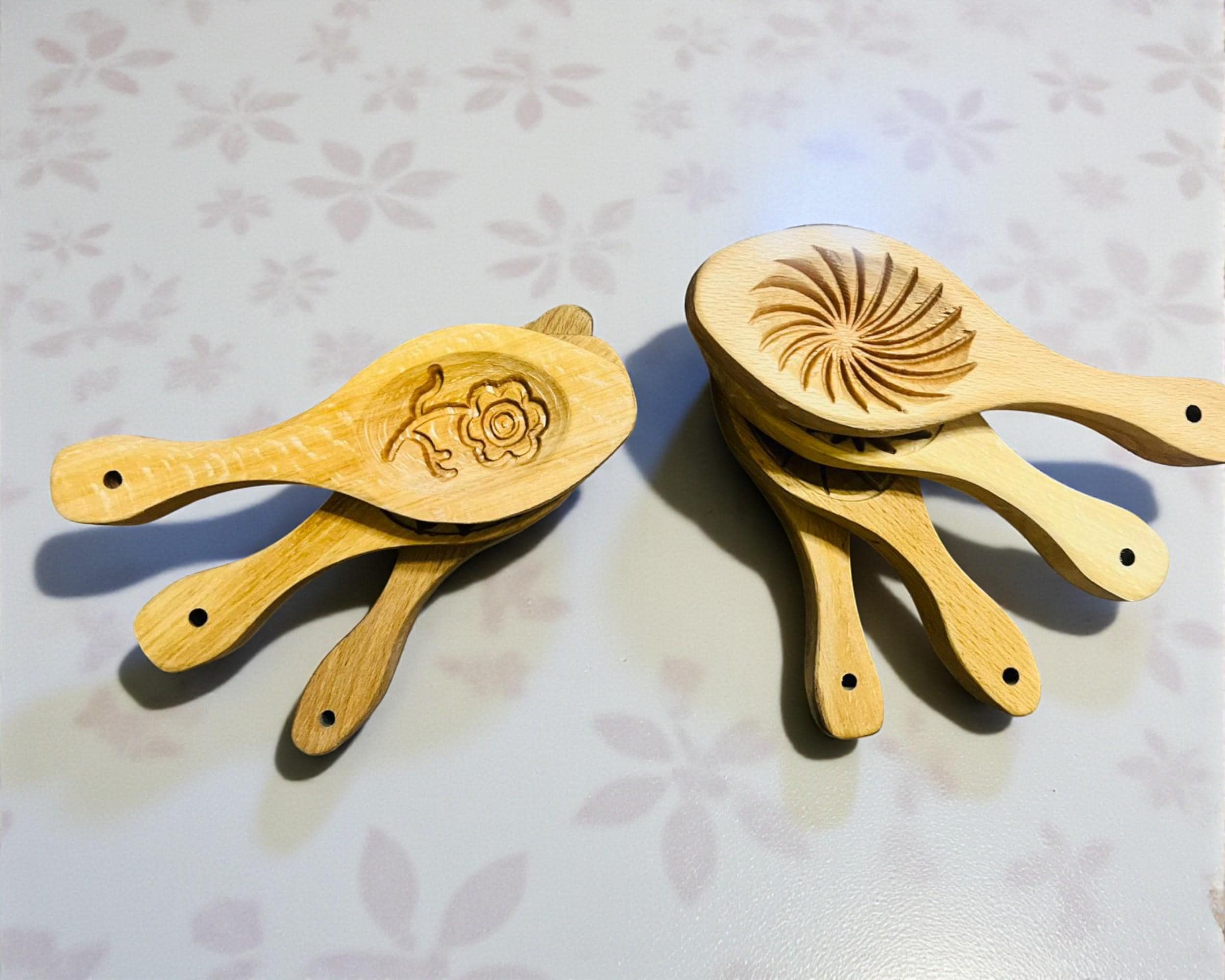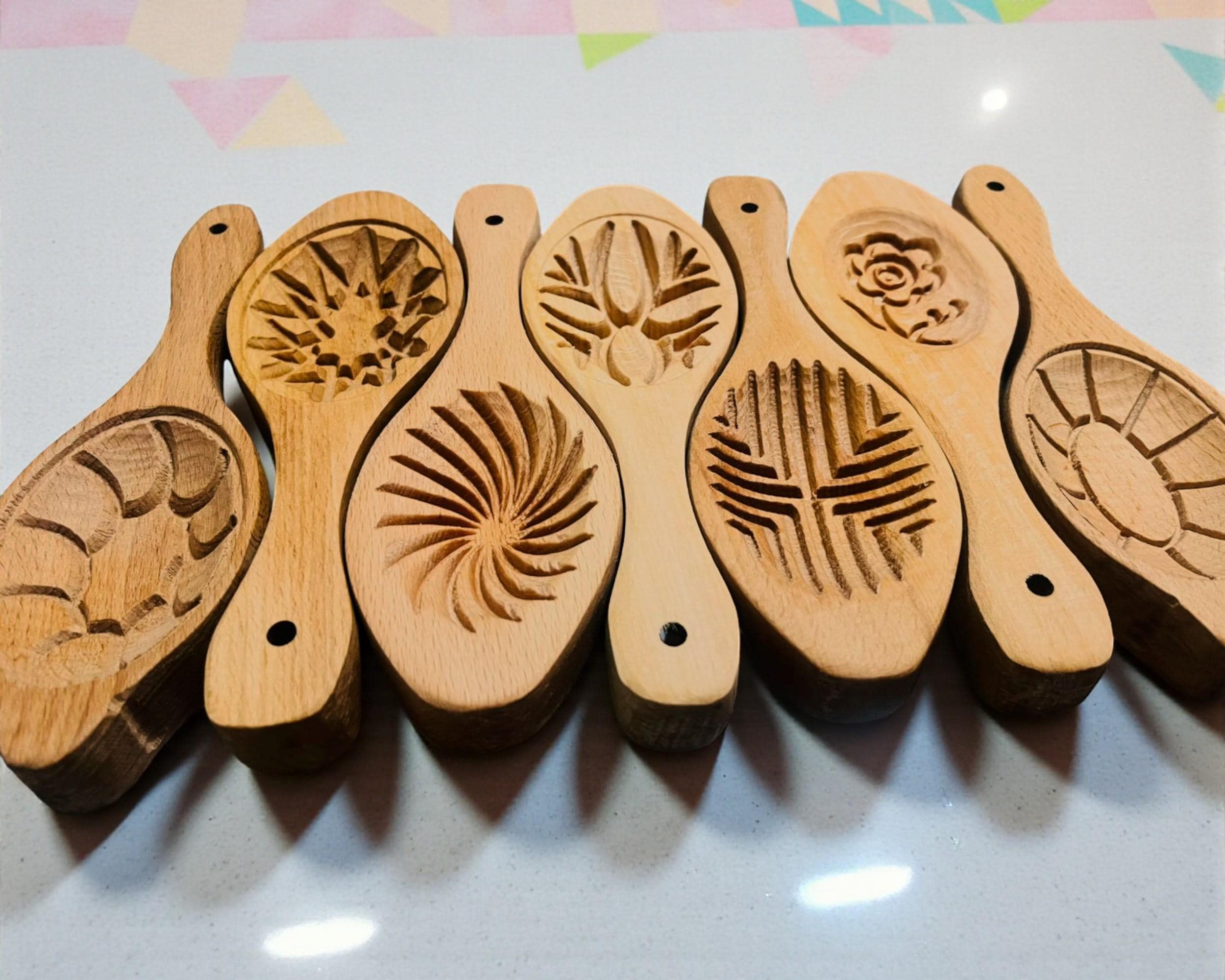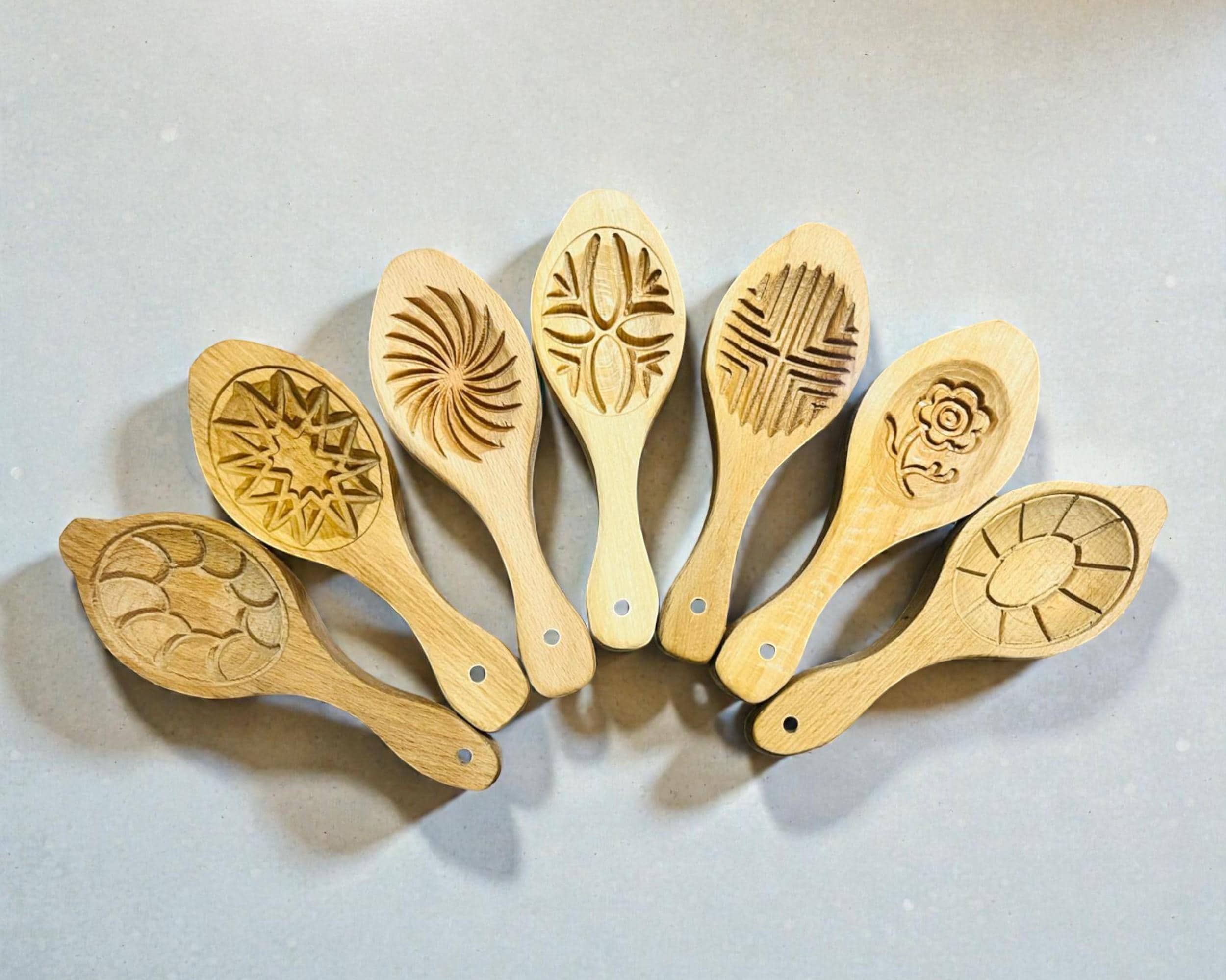 This traditional Hatay cookie mold set is a handcrafted wooden baking tool used to shape and decorate Kömbe, a spiced holiday cookie from southern Türkiye. Each mold features a unique carved pattern that gives cookies their distinctive traditional appearance. Made from durable natural wood, these molds can be purchased individually or as a complete 7-piece set. Perfect for Middle Eastern, Mediterranean, and artisan baking, these molds bring cultural heritage and decorative charm to homemade cookies.